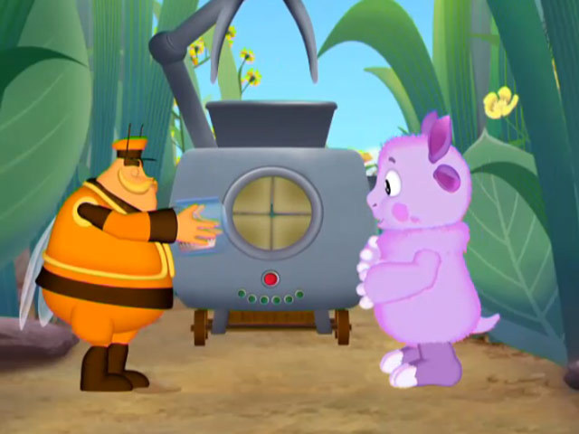 Лунтик и Шер пытаются научиться управлять машиной, которая собирает ягоды.